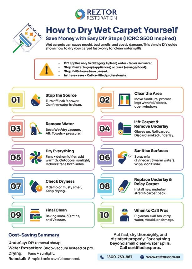 Confirm dryness with professional moisture testing before replacing furniture or underlay.