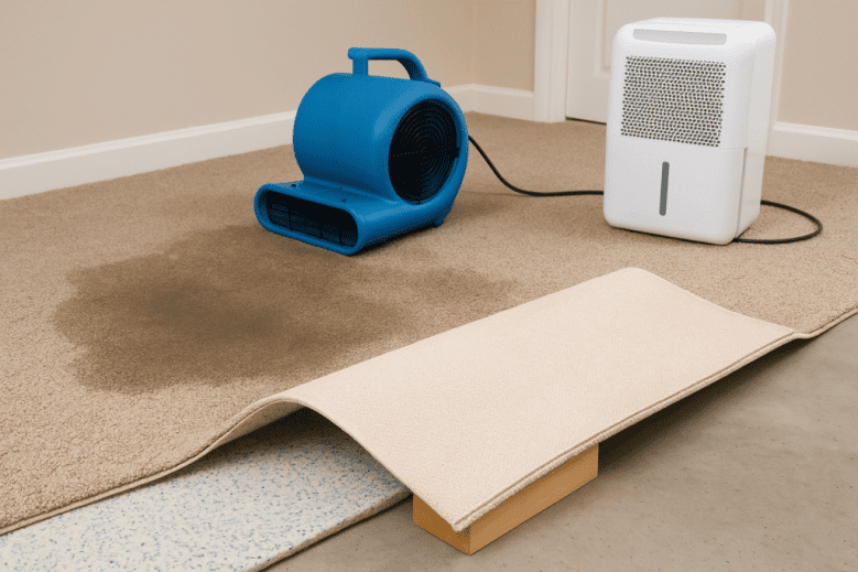 Time is critical. Carpets can begin to grow mould within 24–48 hours. As soon as you notice wet carpet, start the drying process immediately.